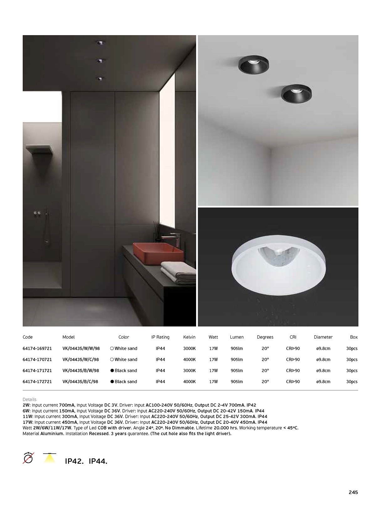 Χωνευτό φωτιστικό οροφής led, 17W, 4000K, 905lm, 20°, CRI>90, IP44, ø9.8x6.1cm, λευκό